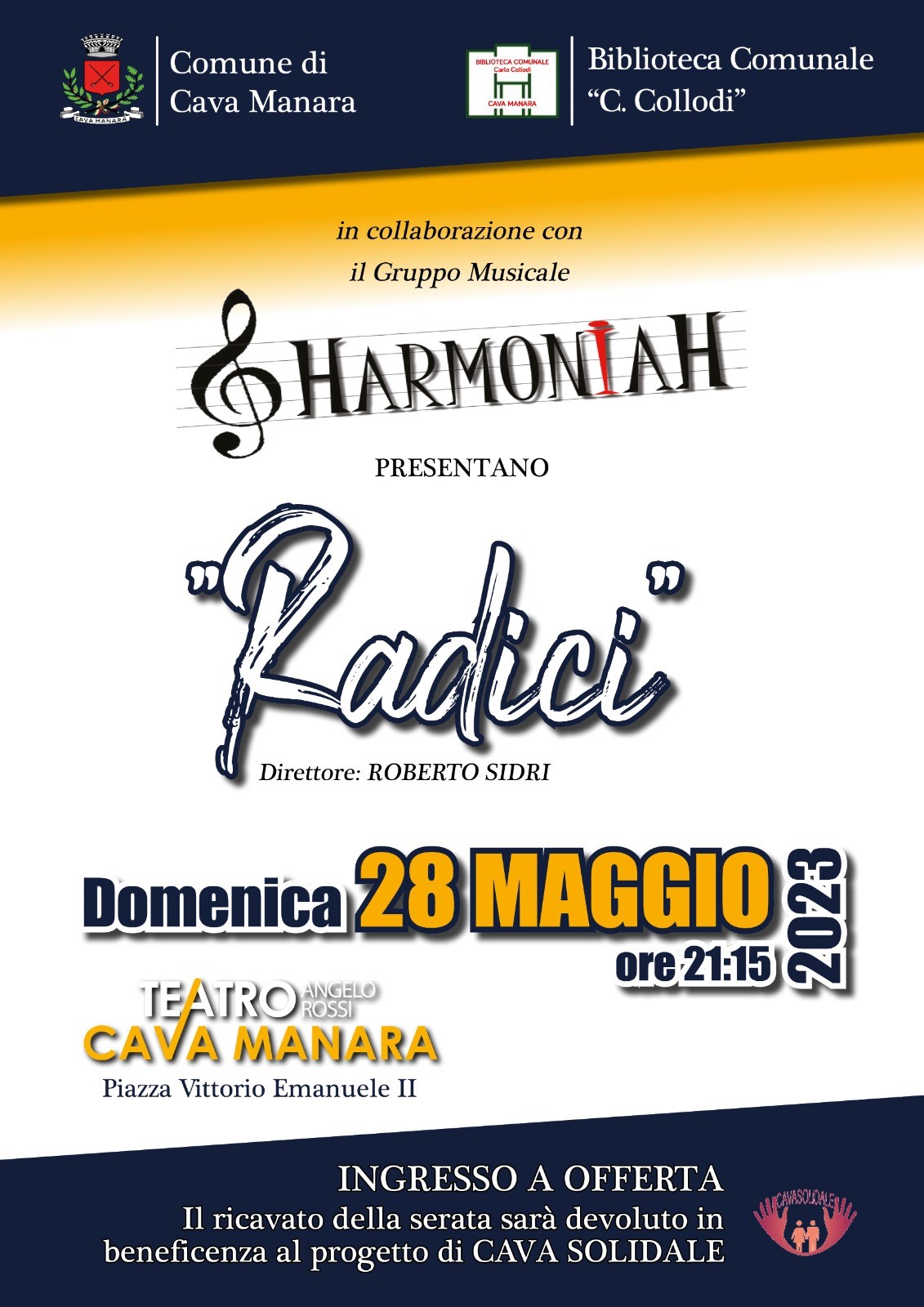 L'Amministrazione Comunale e la Biblioteca Comunale C. Collodi, in collaborazione con il Gruppo musicale Harmoniah, presentano il concerto "Radici" che si terrà presso il Teatro Comunale Angelo Rossi domenica 28 maggio alle ore 21:15.