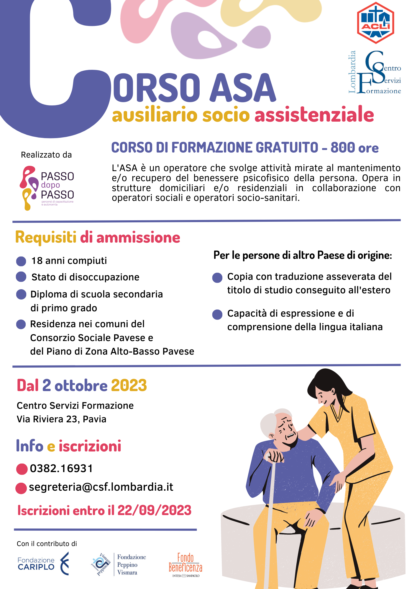 In allegato locandina relativa al corso di formazione gratuito per operatore ausiliario socio-assistenziale, offerto dal Centro Servizi Formazione di Via Riviera 23 - Pavia.