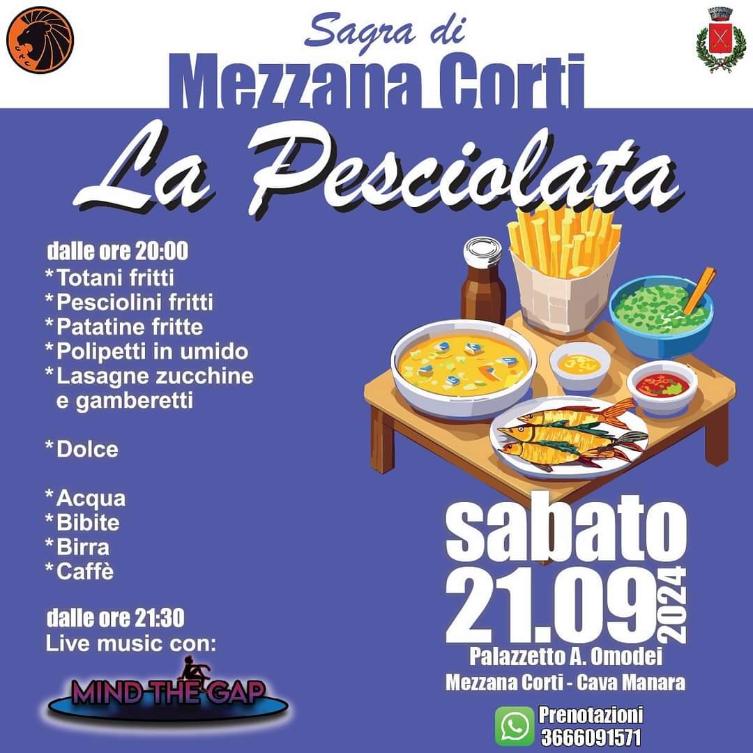 L'Amministrazione Comunale, in collaborazione con la Biblioteca "C. Collodi" e il Gruppo Animatori Cavese, organizza, nell'ambito della Sagra di Mezzana Corti 2024, l'evento "La Pesciolata" per sabato 21 settembre a partire dalle ore 20:00, presso il Palazzetto dello Sport.
