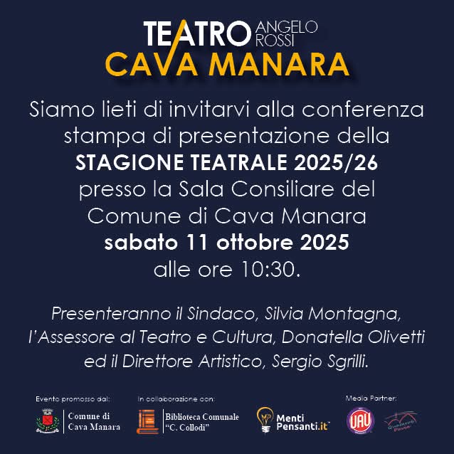 📅 Sabato 11 ottobre 2025, alle ore 10:30, presso la Sala Consiliare del Comune di Cava Manara, si terrà la rassegna stampa ufficiale di presentazione della nuova stagione teatrale 2025/2026.