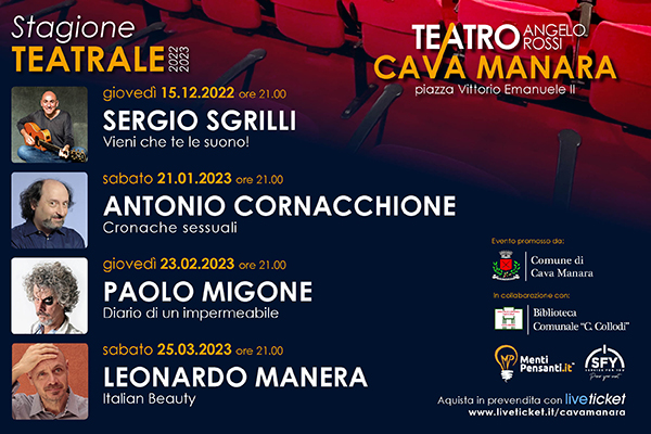 Sergio Sgrilli (Direttore Artistico): “Dopo la conferenza stampa posso ufficializzare con orgoglio che firmo la direzione artistica del Teatro “Angelo Rossi” di Cava Manara (PV) per la stagione 2022/23. Ringrazio il sindaco Michele Pini e tutta l’amministrazione comunale per lo sforzo fatto, gli artisti e amici Antonio Cornacchione, Paolo Migone e Leonardo Manera che ci sono venuti incontro aderendo al progetto. Ringrazio inoltre la Menti Pensati srl per il supporto. In ballo ci sono ancora molte idee e progetti ma intanto: partiamo ridendo con stile e sorriso!”