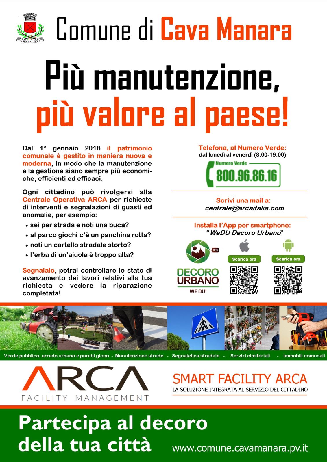 Ogni cittadino può rivolgersi alla Centrale Operativa della società ARCA per una serie di richieste e segnalazioni tra le quali manutenzione stradale, manutenzione verde, decoro e arredo urbano.