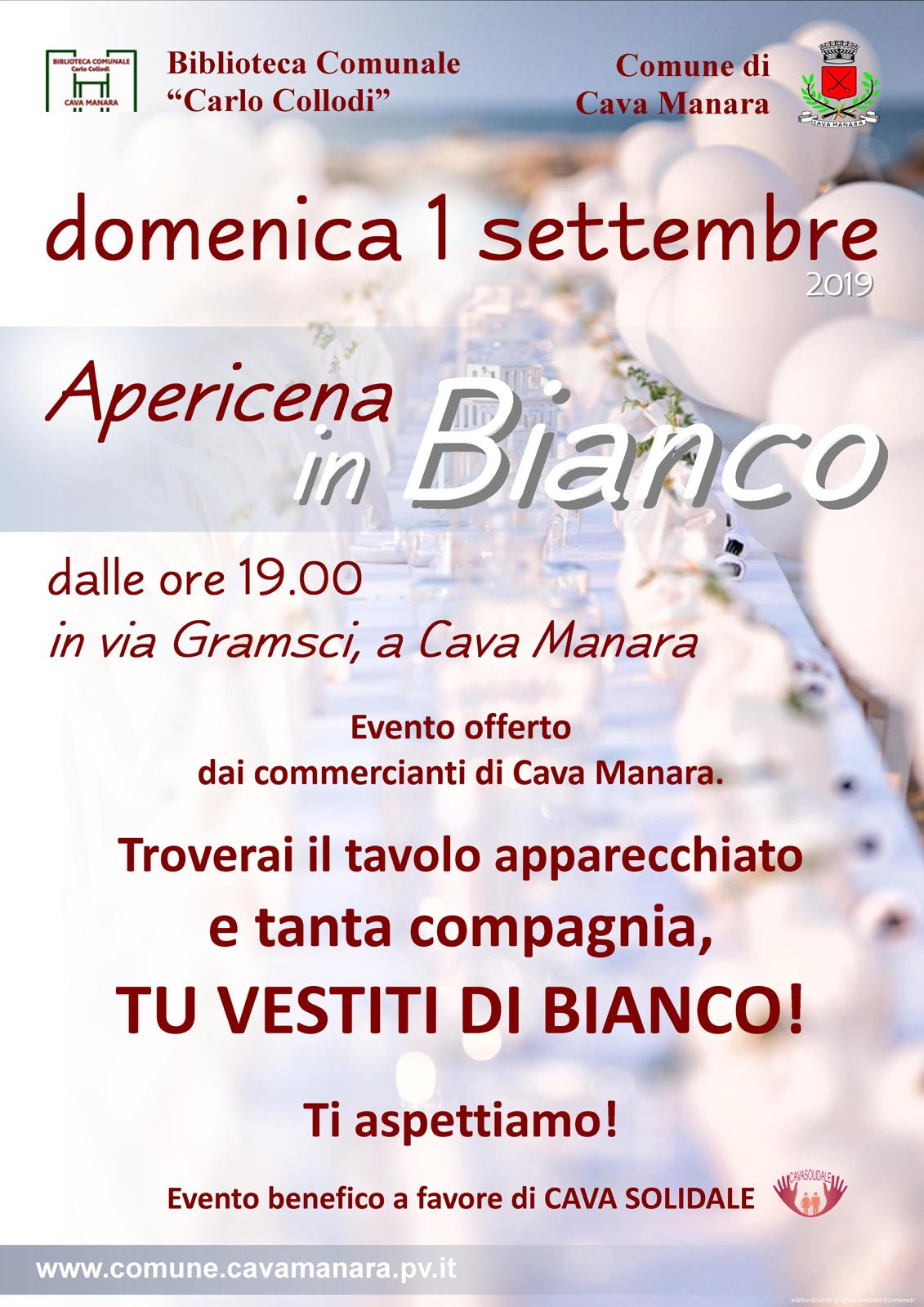 L'Amministrazione Comunale, in collaborazione con la Biblioteca "Carlo Collodi", organizza per domenica 1 settembre un'apericena in bianco.