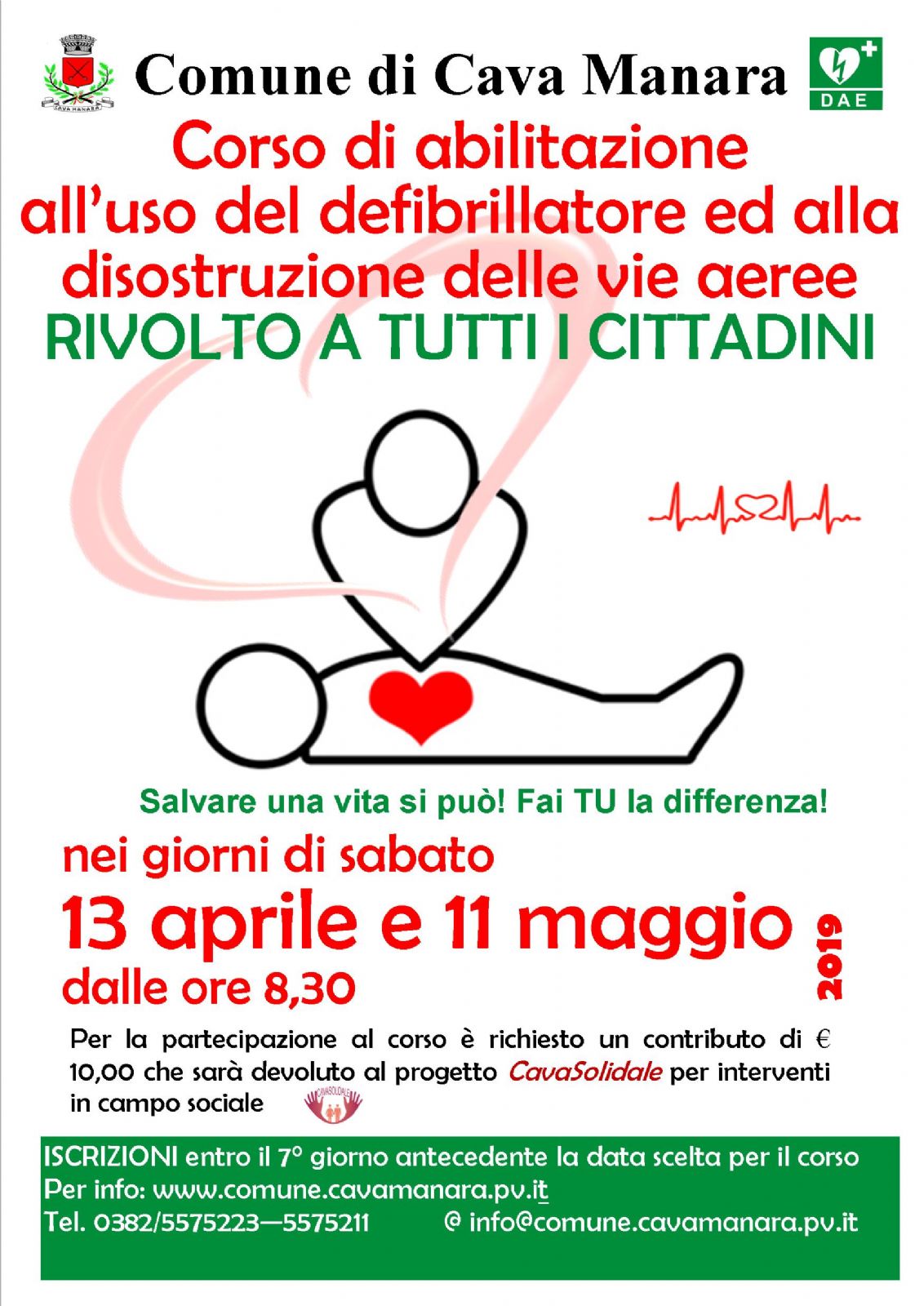 Nelle mattinate di sabato 13 aprile e sabato 11 maggio 2019, presso la Sala Teatro "A. Rossi" si svolgerà un corso di abilitazione all'uso del defibrillatore e alla disostruzione delle vie aeree, rivolto a tutti i cittadini.