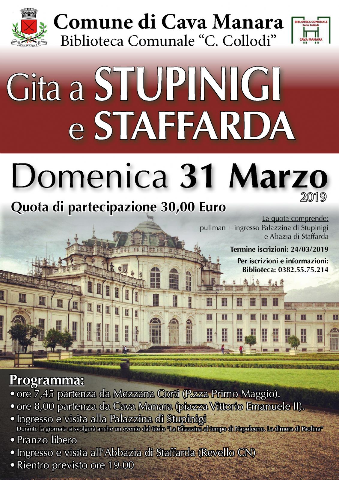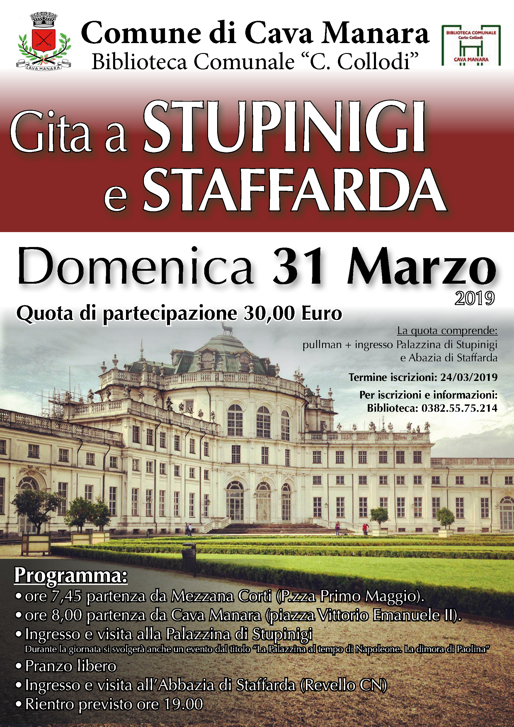 L'Amministrazione Comunale, in collaborazione con la Biblioteca "C. Collodi", organizza per Domenica 31 Marzo 2019 una gita a Stupinigi e Staffarda, come da programma allegato.