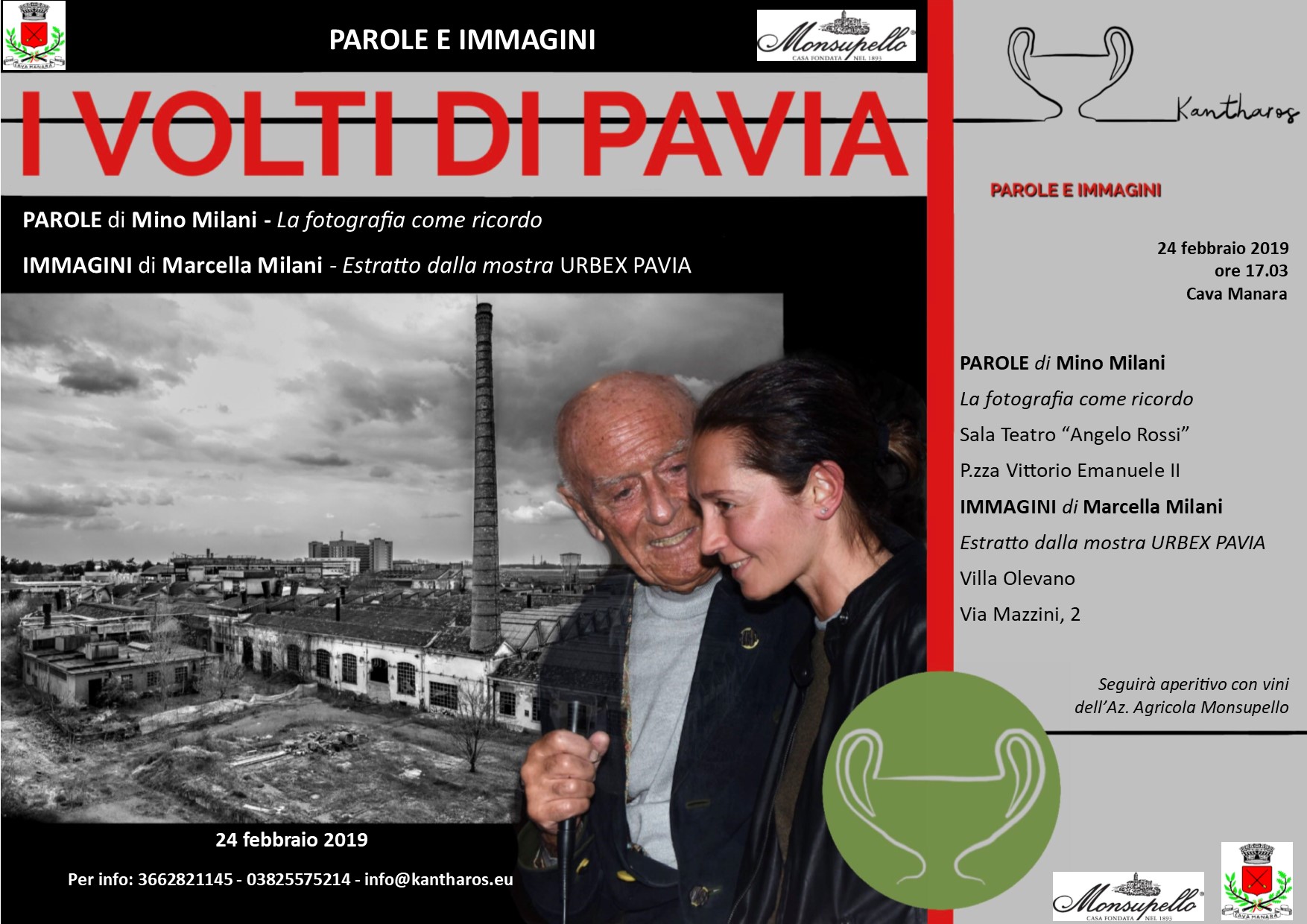 Il Comune di Cava Manara e l’Associazione Culturale Kantharos organizzano una giornata all’insegna della cultura. Domenica 24 febbraio, a Cava Manara, saranno presenti due grandissimi nomi: Mino e Marcella Milani che guideranno il pubblico, grazie alle parole del primo e alle immagini della seconda, attraverso un viaggio nella memoria pavese.