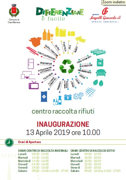 Sabato 13 aprile, alle ore 10.00 si terrà l'inaugurazione del nuovo centro di raccolta comunale appena riqualificato e ammodernato. In allegato opuscolo informativo sui servizi offerti, modalità d'accesso alla piazzola e materiale conferibile.