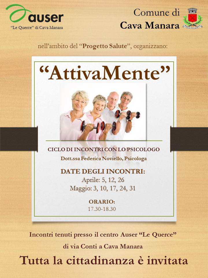 L'Auser "Le Querce" ed il Comune di Cava Manara organizzano, nell'ambito del "Progetto Salute", un ciclo di incontri con la Psicologa Dott.ssa Federica Noviello, presso la sede Auser di Via Conti in Cava Manara.