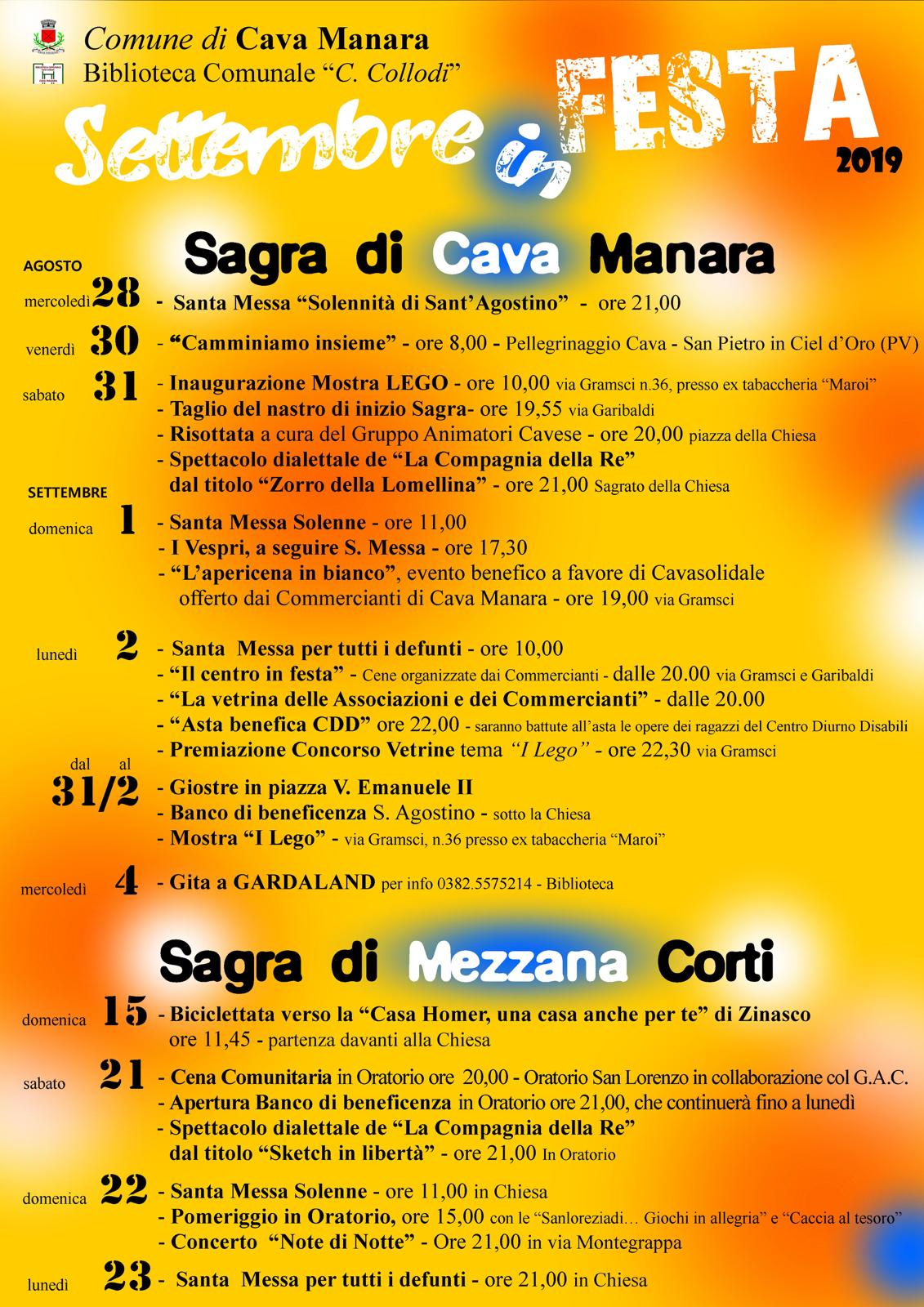 L'Amministrazione Comunale, in collaborazione con la Biblioteca "Carlo Collodi", organizza fra agosto e settembre la sagra di Cava Manara e la sagra di Mezzana Corti.