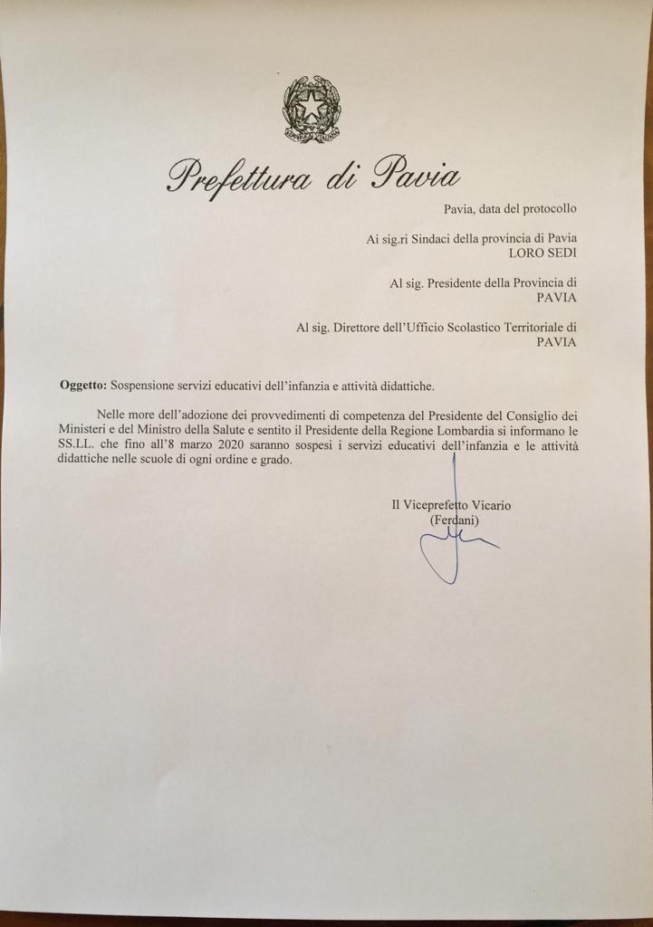 Si informa la cittadinanza che i servizi educativi e le attività didattiche nelle scuole di ogni ordine e grado rimarranno sospese fino all'8 marzo. In allegato comunicazione della Prefettura di Pavia.