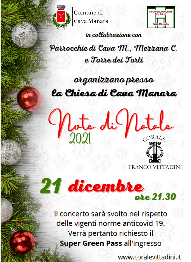 Il Comune di Cava Manara e la Biblioteca Comunale, in collaborazione con le Parrocchie di Cava Manara, Mezzana Corti e Torre de' Torti, organizzano per il 21 dicembre 2021 alle ore 21:30, presso la Chiesa di Cava Manara, il concerto "Note di Natale 2021" con la Corale Franco Vittadini di Pavia e orchestra dirette dal Maestro Gian Marco Moncalieri.