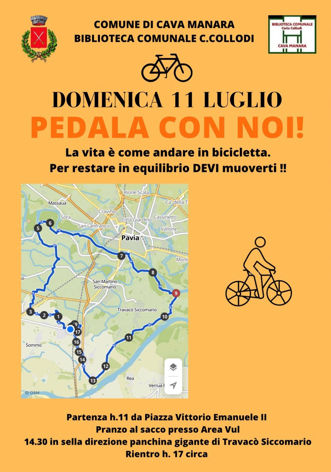 L'Amministrazione Comunale, in collaborazione con la Biblioteca Comunale C. Collodi, organizza per domenica 11 luglio una biciclettata con destinazione finale la panchina gigante di Travacò Siccomario.