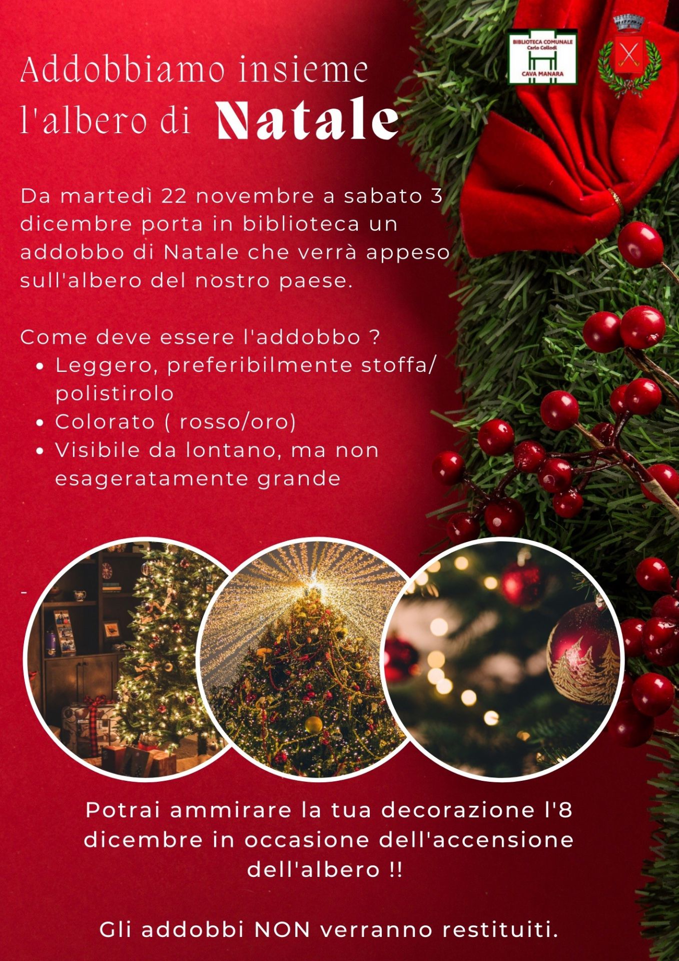 L'Amministrazione Comunale, in collaborazione con la Biblioteca Comunale, invita i bambini e la cittadinanza a creare gli addobbi per l'Albero di Natale che sarà acceso, come di consueto, l'8 dicembre.