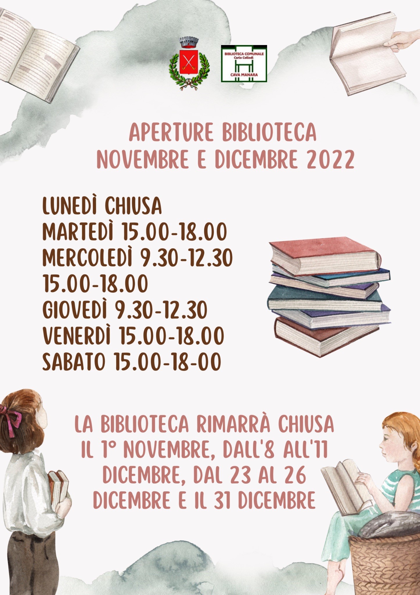 Si pubblica il calendario delle aperture della Biblioteca Comunale nei mesi di novembre e dicembre.