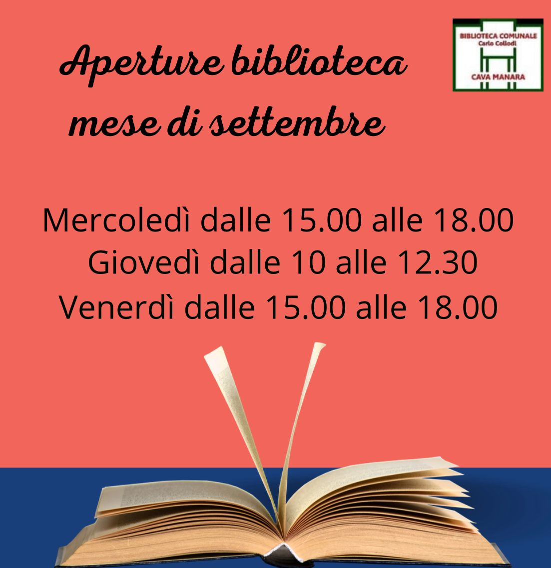 Si pubblica il calendario delle aperture della Biblioteca Comunale nel mese di settembre.