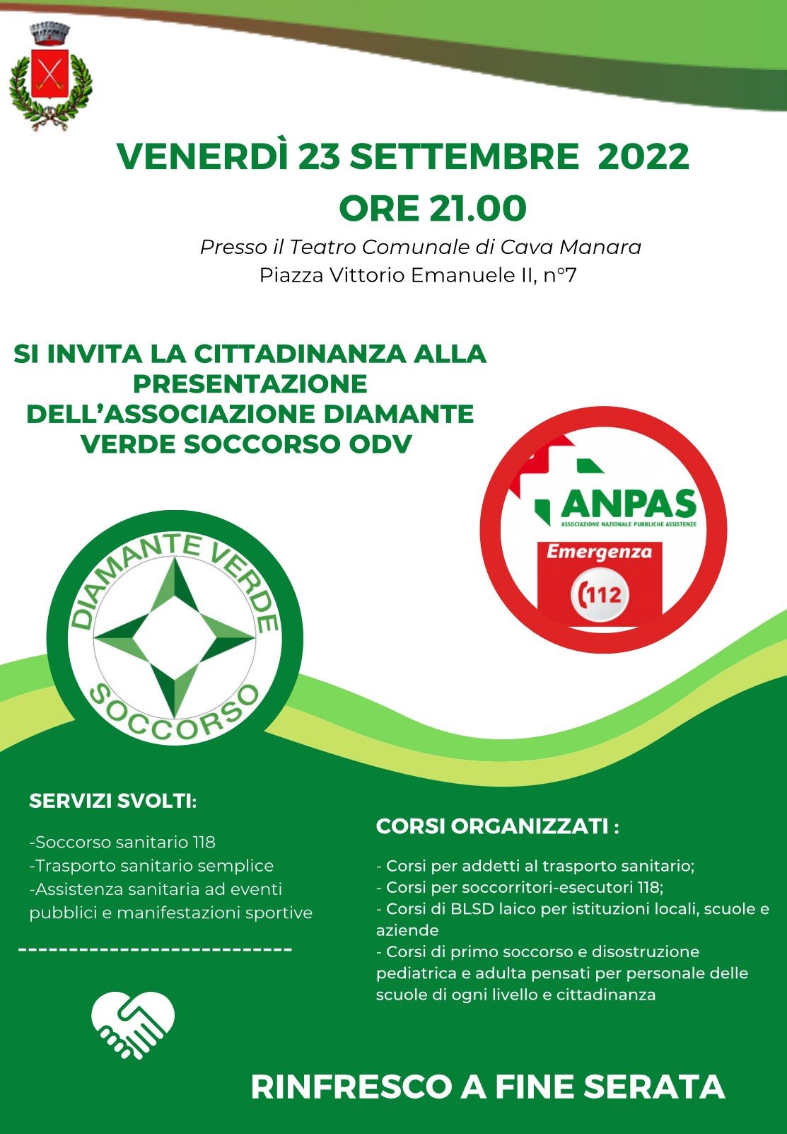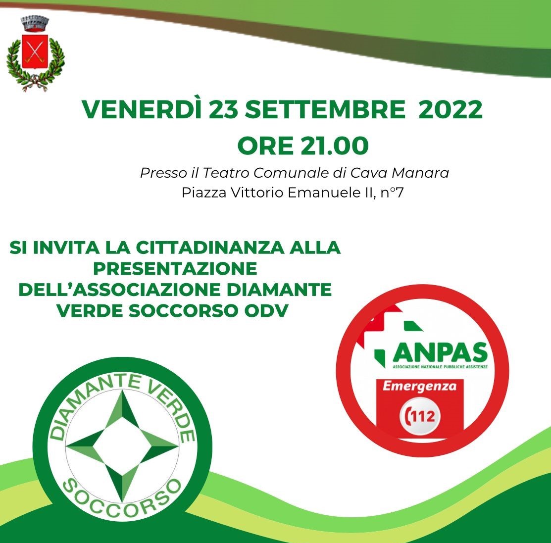 Si invita la cittadinanza all'incontro di presentazione dell'Associazione Diamante Verde Soccorso che si terrà il prossimo 23 Settembre alle ore 21:00 presso il Teatro Comunale in Piazza Vittorio Emanuele II.