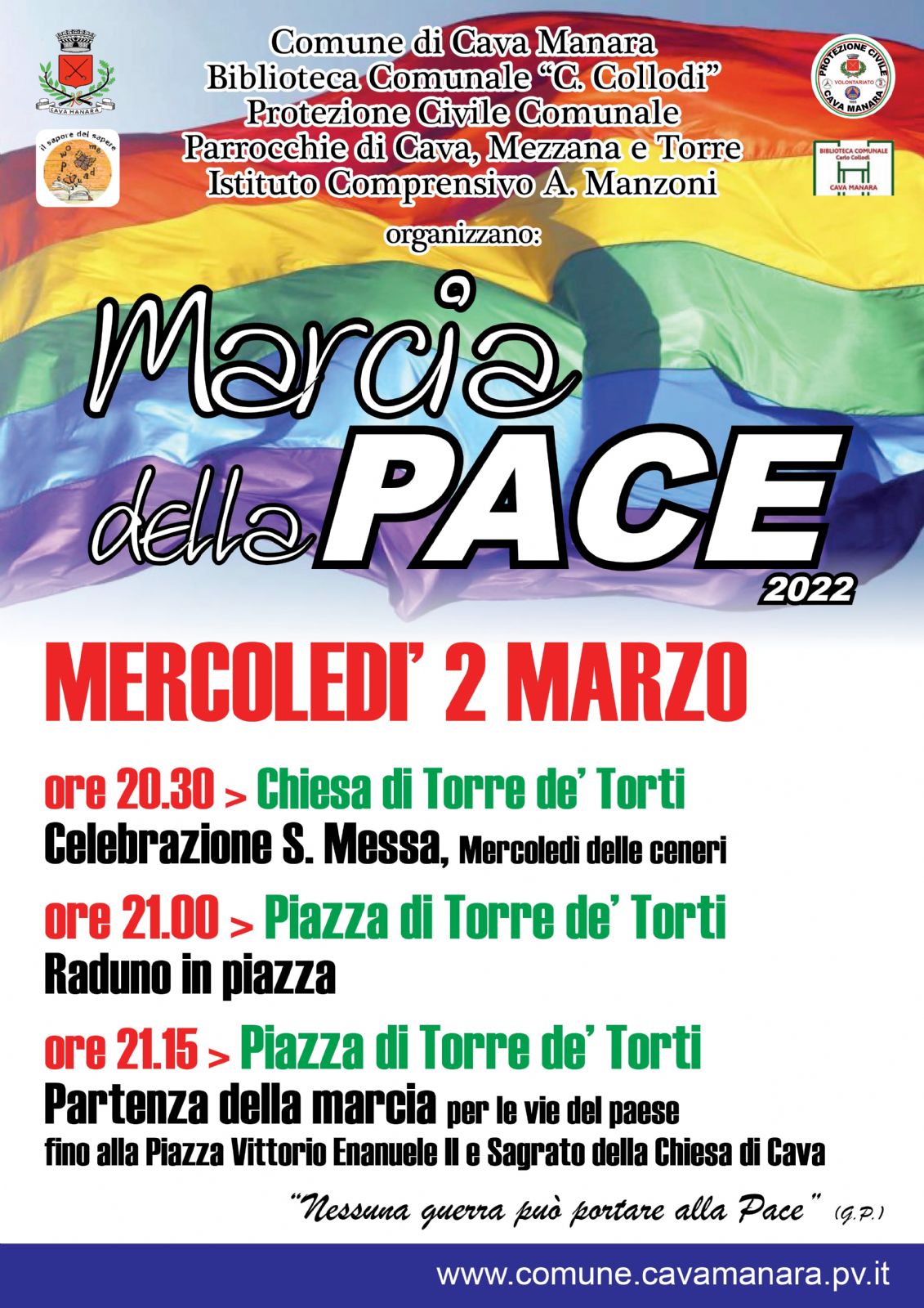 Il Comune di Cava Manara, la Biblioteca Comunale "Carlo Collodi", la Protezione Civile Comunale, le Parrocchie di Cava Manara, Mezzana Corti e Torre de' Torti e l'Istituto Comprensivo "A. Manzoni" organizzano la Marcia della Pace 2022 per mercoledì 2 marzo con partenza dalla Piazza di Torre de' Torti.