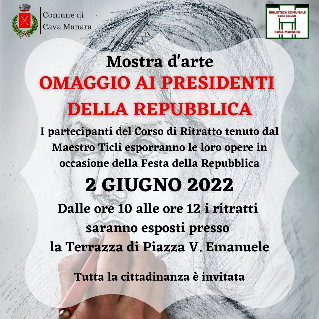 L'Amministrazione Comunale, in collaborazione con la Biblioteca Comunale Carlo Collodi, organizza per il 2 giugno 2022, in occasione della Festa della Repubblica, la mostra "Omaggio ai Presidenti della Repubblica" con i lavori realizzati dai partecipanti al Corso di Ritratto tenuto dal Maestro Ticli.