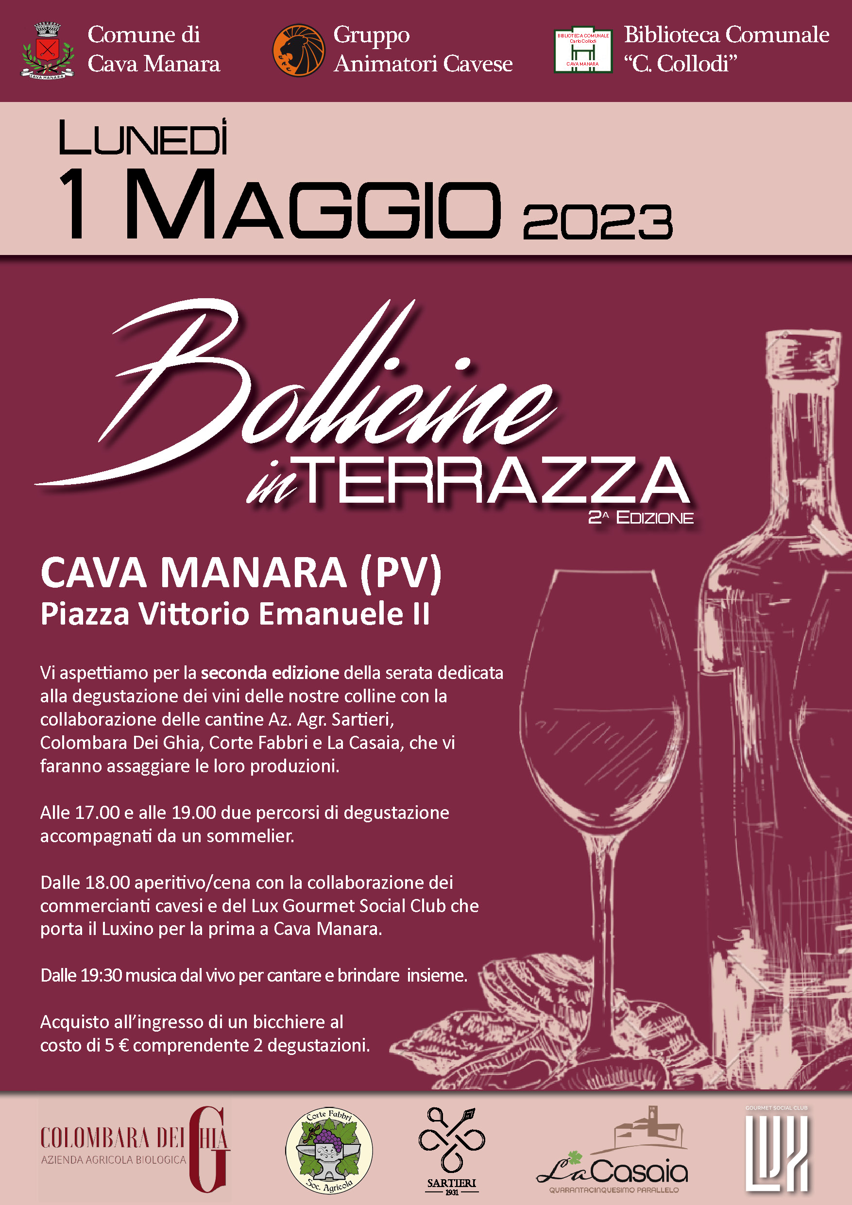 L'Amministrazione Comunale, in collaborazione con la Biblioteca Comunale "C. Collodi" e il Gruppo Animatori Cavese, organizza per lunedì 1° maggio la seconda edizione dell'evento "Bollicine in terrazza", giornata di degustazione di vini e cibo con la collaborazione dei commercianti locali e delle cantine La Casaia, Colombara dei Ghia, Corte Fabbri, Sartieri e Lux Gourmet Social Club che faranno assaggiare le loro produzioni.