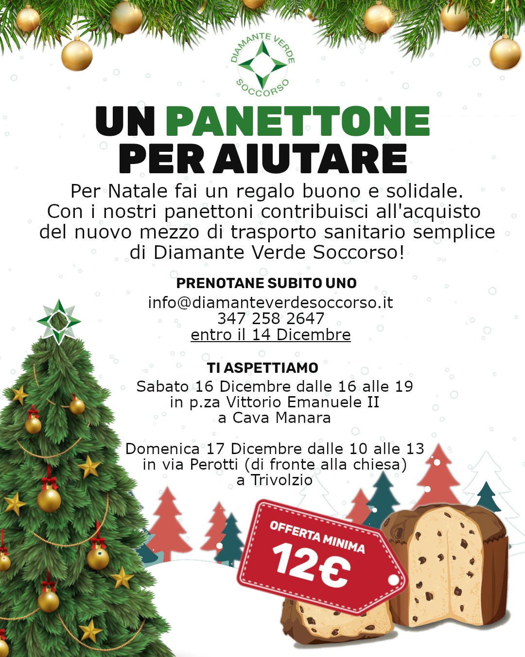 L'Associazione Diamante Verde Soccorso organizza per sabato 16 dicembre dalle ore 16:00 alle 19:00 in Piazza Vittorio Emanuele II, una vendita di panettoni per finanziare l'acquisto di un nuovo mezzo di trasporto sanitario.