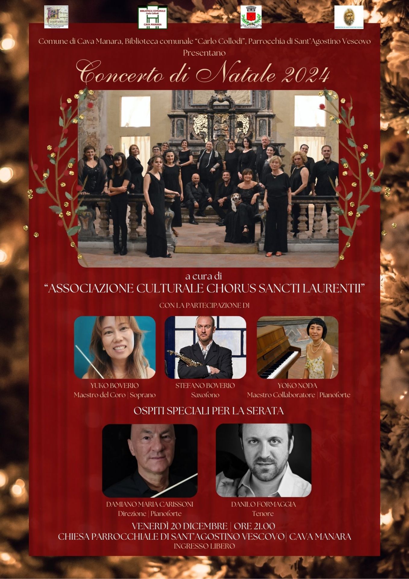 Il Comune di Cava Manara e la Biblioteca Comunale "C. Collodi", in collaborazione con le Parrocchie di Cava Manara, Mezzana Corti e Torre de' Torti, organizzano per il 20 dicembre 2024 alle ore 21:00, presso la Chiesa di Cava Manara, il "Concerto di Natale 2024" con l'Associazione Culturale Chorus Sancti Laurentii diretta dalla Soprano e Maestro Yuko Boverio e con la partecipazione di Stefano Boverio al saxofono e del Maestro Collaboratore Yoko Noda al pianoforte.