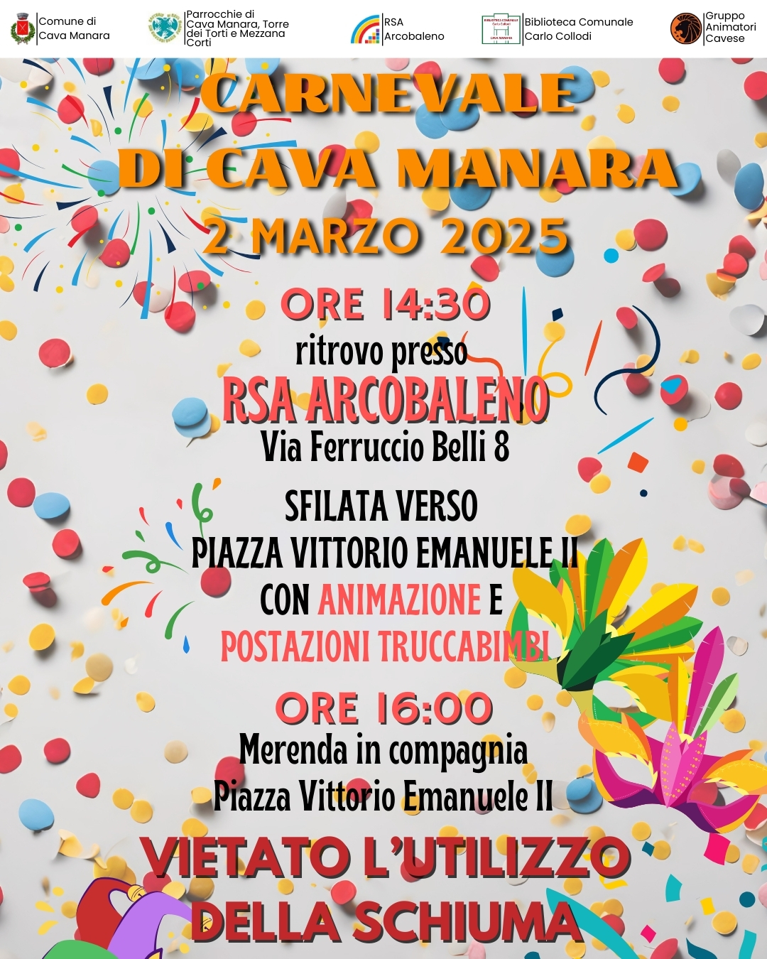 L'Amministrazione Comunale, in collaborazione con la Biblioteca Comunale "Carlo Collodi", le Parrocchie di Cava Manara, Mezzana Corti e Torre de' Torti ed Il Gruppo Animatori Cavese, organizza per domenica 2 MARZO il "Carnevale 2025".
