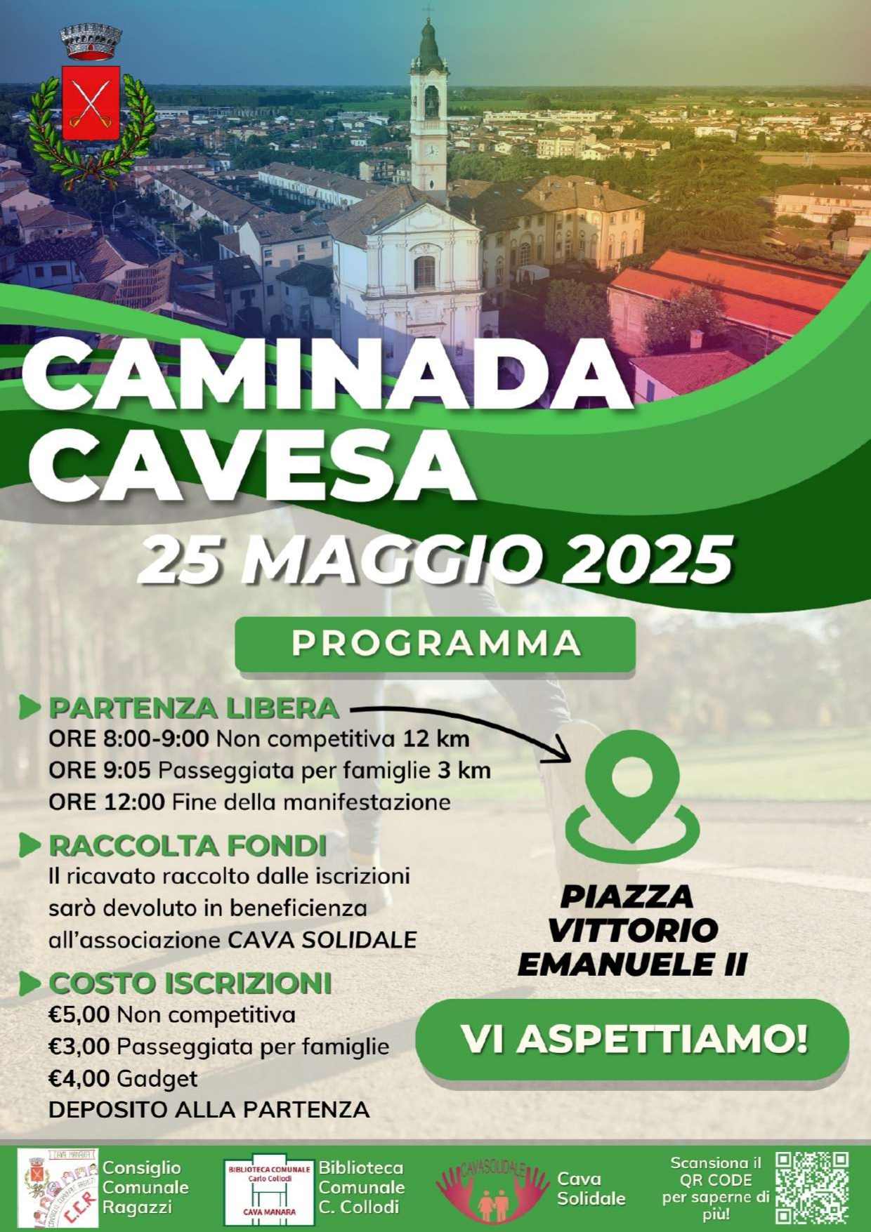 Il Comune di Cava Manara, in collaborazione con il Consiglio Comunale dei Ragazzi e con la Biblioteca Comunale C. Collodi, organizza per domenica 25 maggio la "Caminada Cavesa", una manifestazione podistica non competitiva e una passeggiata per famiglie.