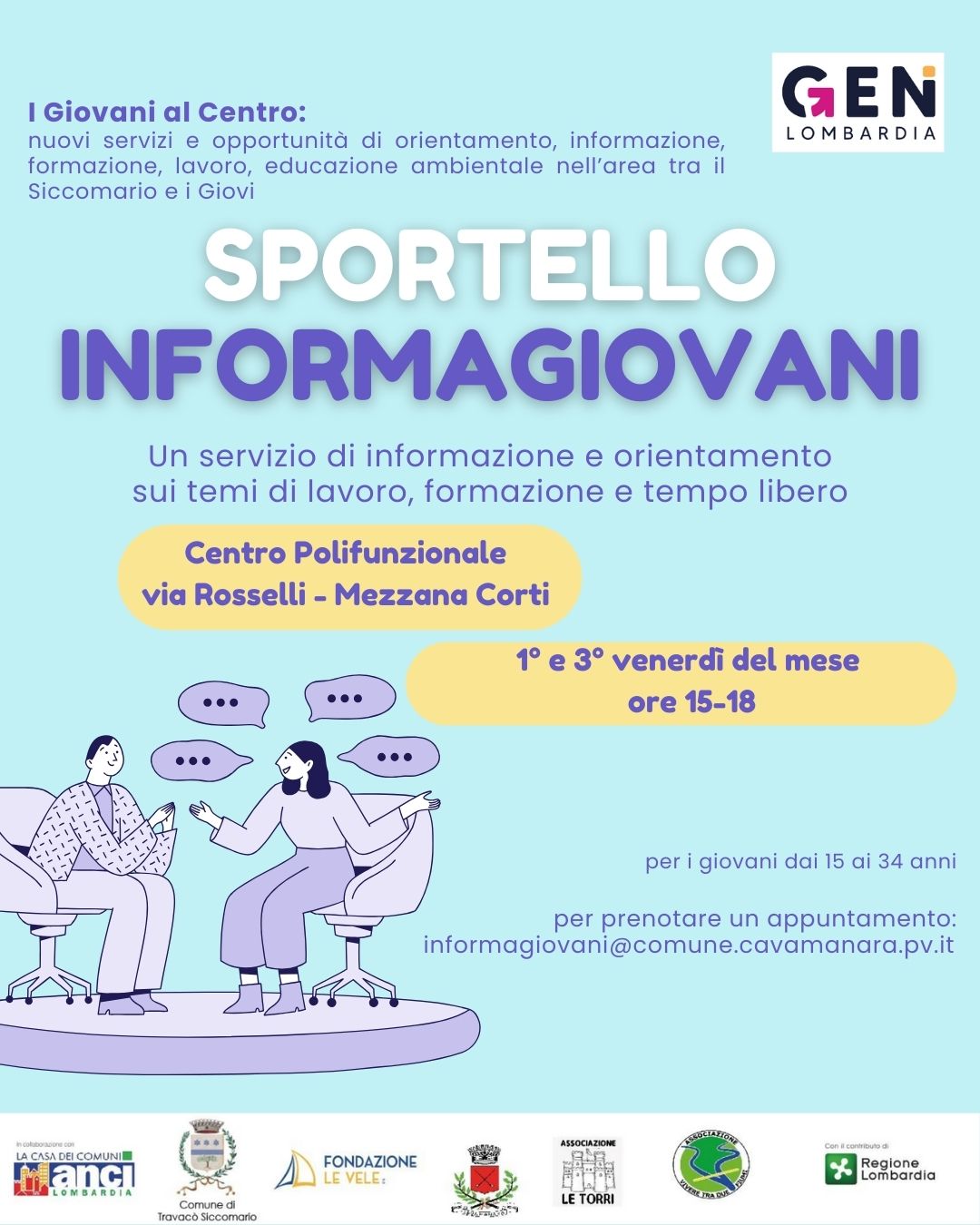 Nell’ambito del progetto (di cui il Comune di Cava Manara è partner) “I Giovani al Centro: nuovi servizi e opportunità di orientamento, informazione, formazione, lavoro, educazione ambientale nell’area tra il Siccomario e i Giovi”, promosso dal Comune di Travacò Siccomario in qualità di capofila e finanziato da Regione Lombardia, prosegue a Cava Manara il nuovo Sportello Informagiovani, un servizio gratuito di informazione e orientamento dedicato ai giovani di età compresa tra i 15 e i 34 anni.