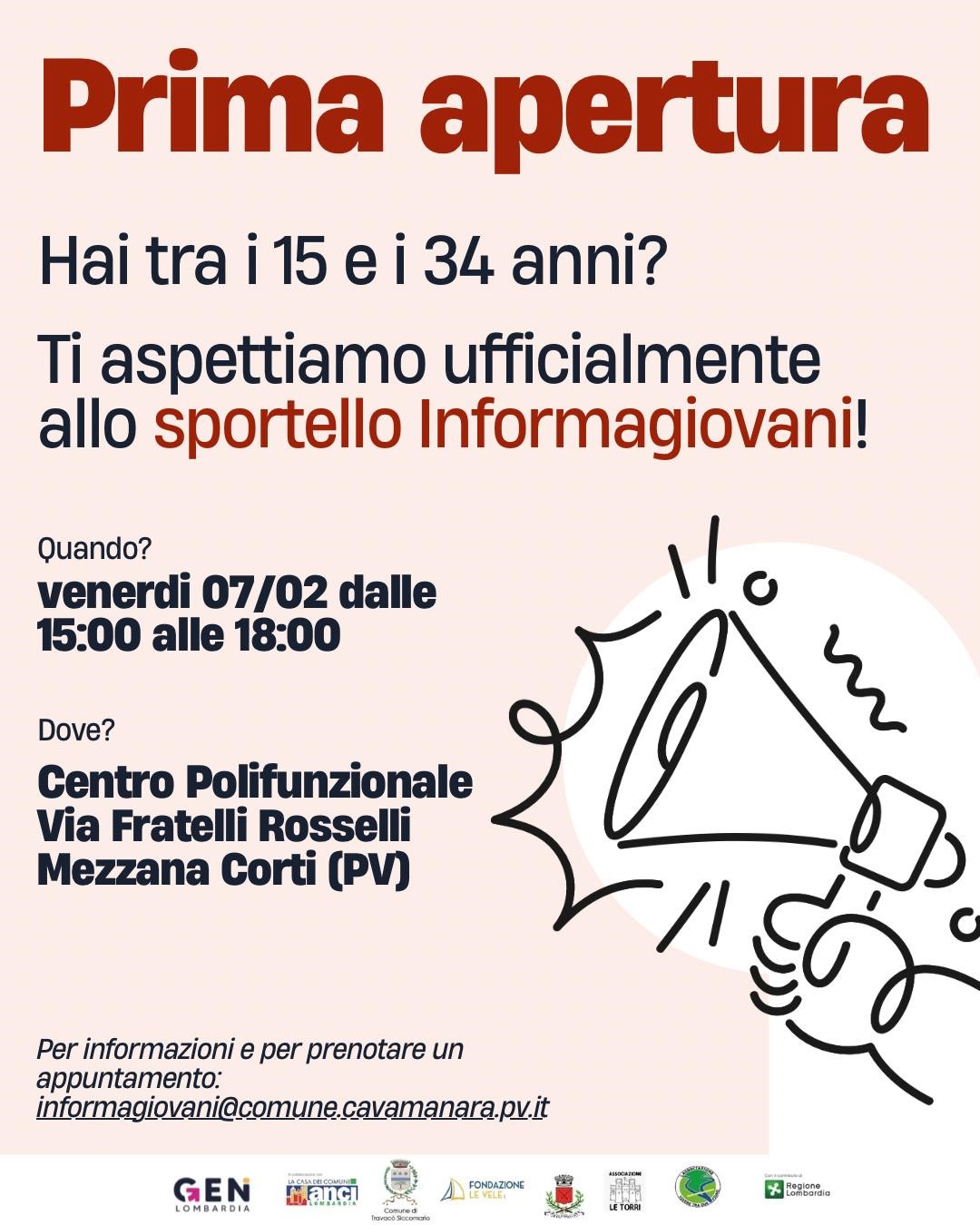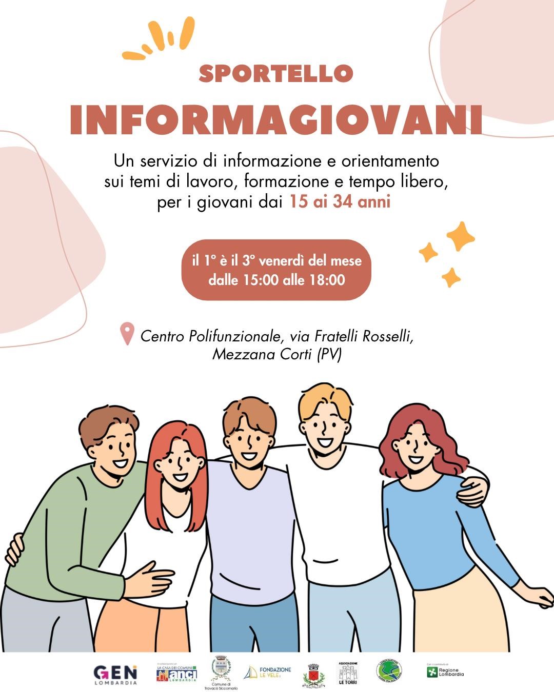 Lo Sportello Informagiovani è aperto il 1° e il 3° venerdì del mese, dalle ore 15:00 alle ore 18:00, presso il Centro Polifunzionale di Mezzana Corti, in Via Fratelli Rosselli.