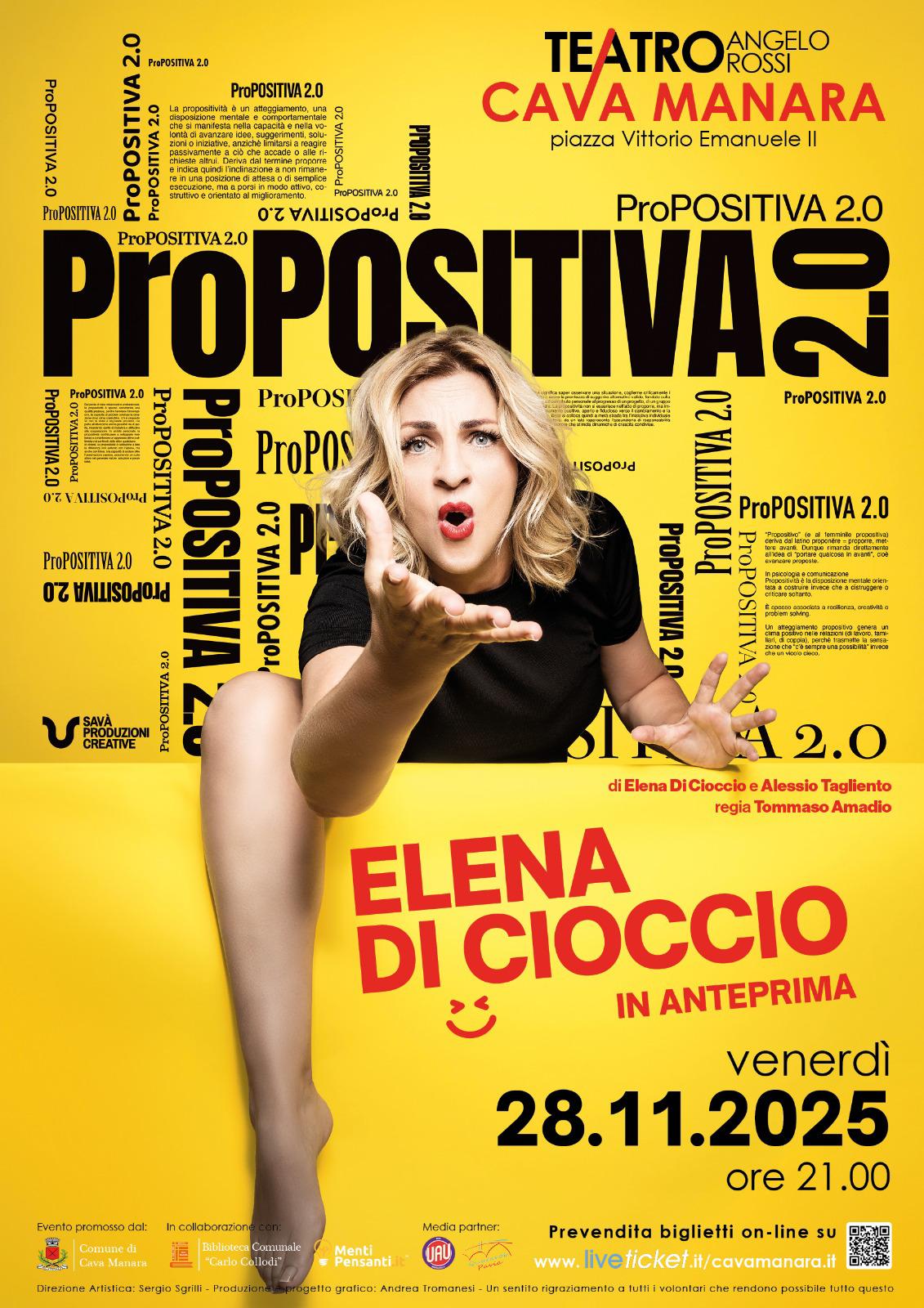 L'Amministrazione Comunale, in collaborazione con la Biblioteca Comunale C. Collodi, ha il piacere di comunicare lo spettacolo fuori cartellone "ProPOSITIVA 2.0" di e con ELENA DI CIOCCIO - Teatro Comunale A. Rossi, Piazza Vittorio Emanuele II, 28 novembre 2025 ore 21:00