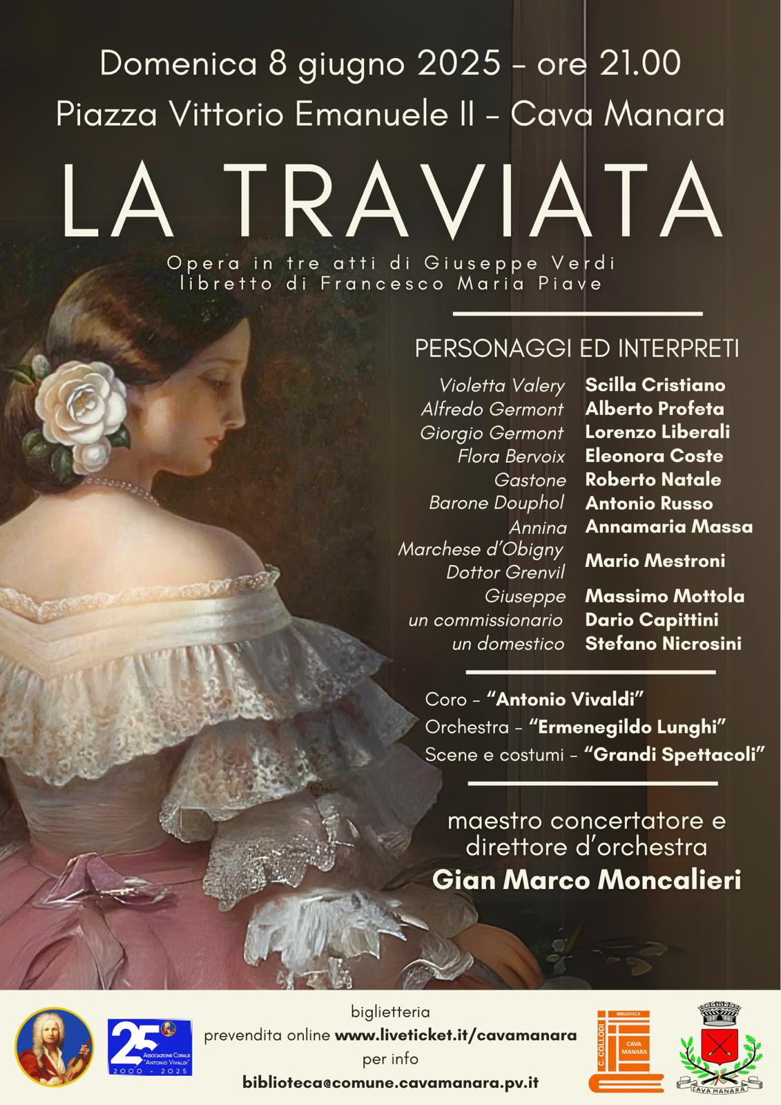 Domenica 8 giugno, alle ore 21:00, in Piazza Vittorio Emanuele II, sarà rappresentata l'opera in forma scenica LA TRAVIATA, melodramma in tre atti su libretto di Francesco Maria Piave e musica di GIUSEPPE VERDI.
