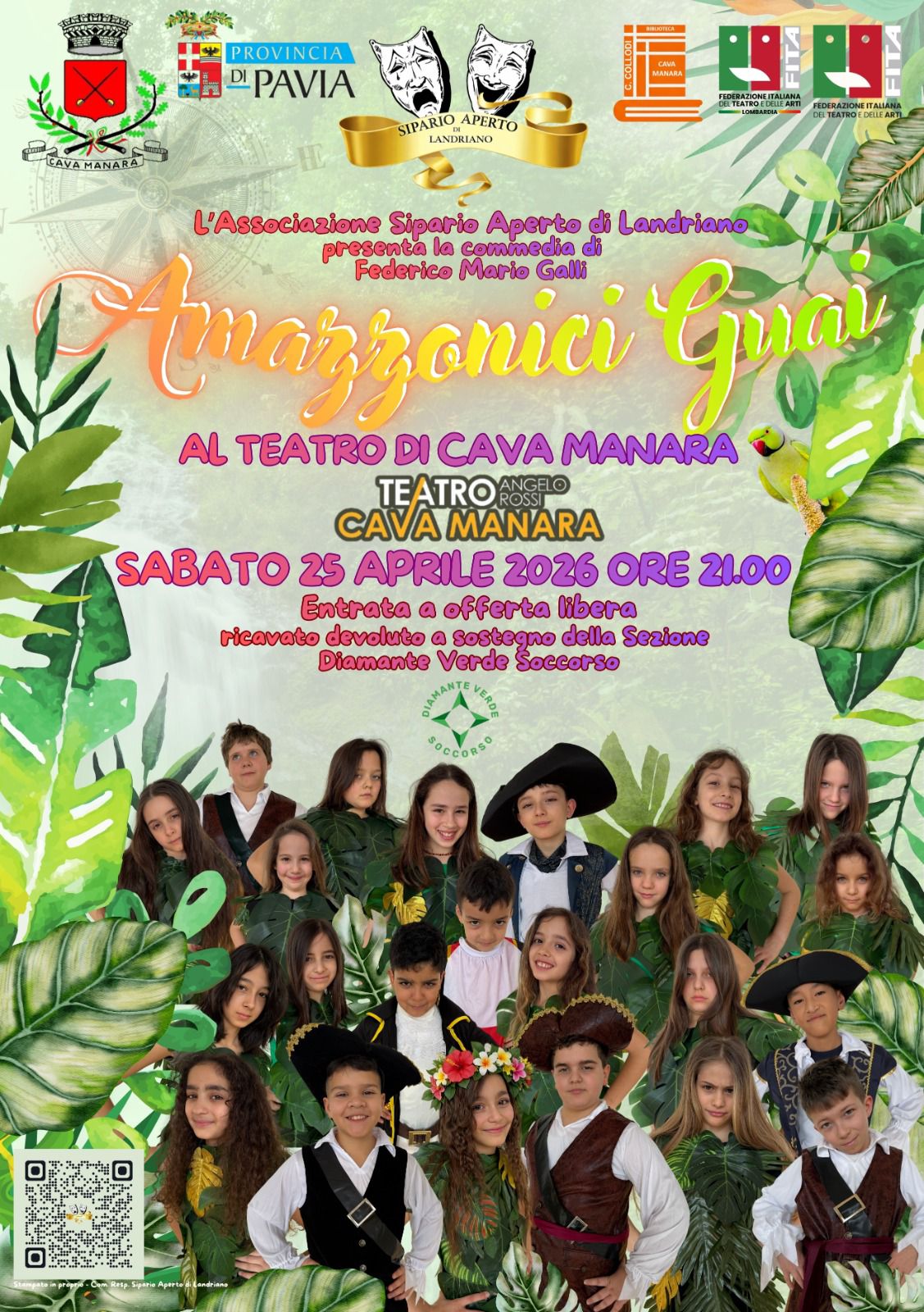 L'Amministrazione Comunale, in collaborazione con la Biblioteca Comunale "Carlo Collodi", la Provincia di Pavia e la Federazione Italiana del Teatro e delle Arti, organizza per sabato 25 aprile 2026 alle ore 21,00 presso il Teatro Comunale "Angelo Rossi", la rappresentazione della commedia di Federico Maria Galli "Amazzonici Guai", interpretata dal gruppo "Associazione Sipario Aperto di Landriano"
