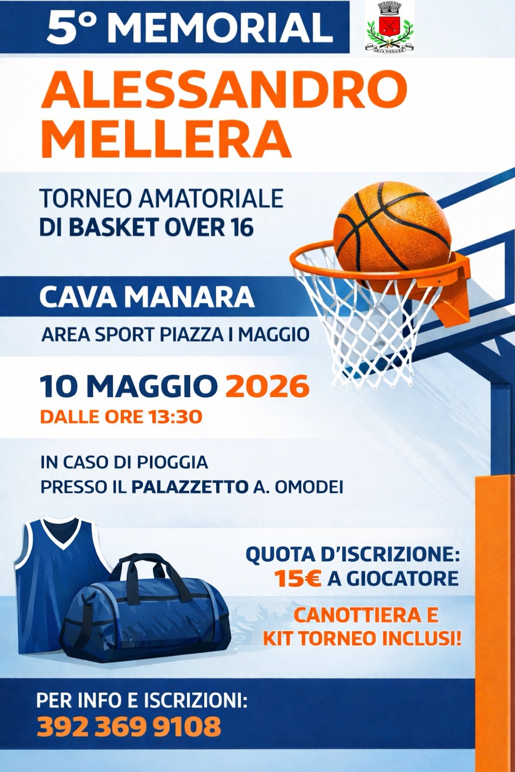 L'Amministrazione Comunale organizza per domenica 10 Maggio p.v. il 5° Memorial "Alessandro Mellera" Torneo amatoriale di basket over 16, presso l'Area Sport di Mezzana Corti in Piazza I Maggio.