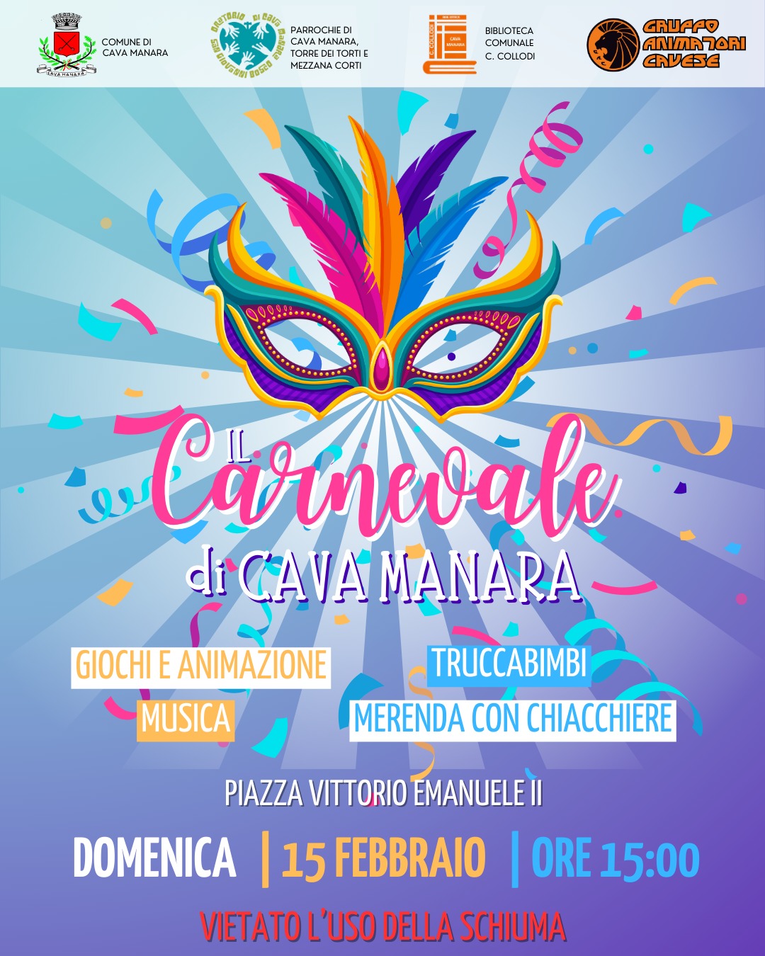 L'Amministrazione Comunale, in collaborazione con la Biblioteca Comunale "Carlo Collodi", le Parrocchie di Cava Manara, Mezzana Corti e Torre de' Torti ed Il Gruppo Animatori Cavese, organizza per domenica 15 FEBBRAIO il "Carnevale 2026".