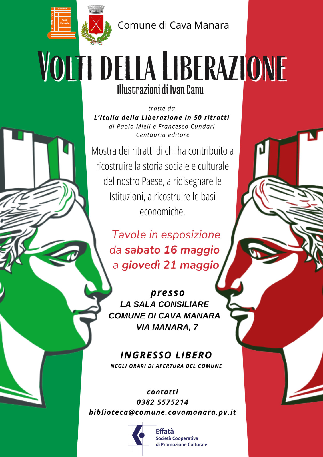 L'Amministrazione comunale e la Biblioteca "C. Collodi" sono liete di invitare la cittadinanza alla mostra dei ritratti di Ivan Canu dal titolo "Volti della Liberazione" presso la Sala Consiliare del Comune negli orari di apertura da sabato 16 maggio a giovedì 21 maggio prossimi.